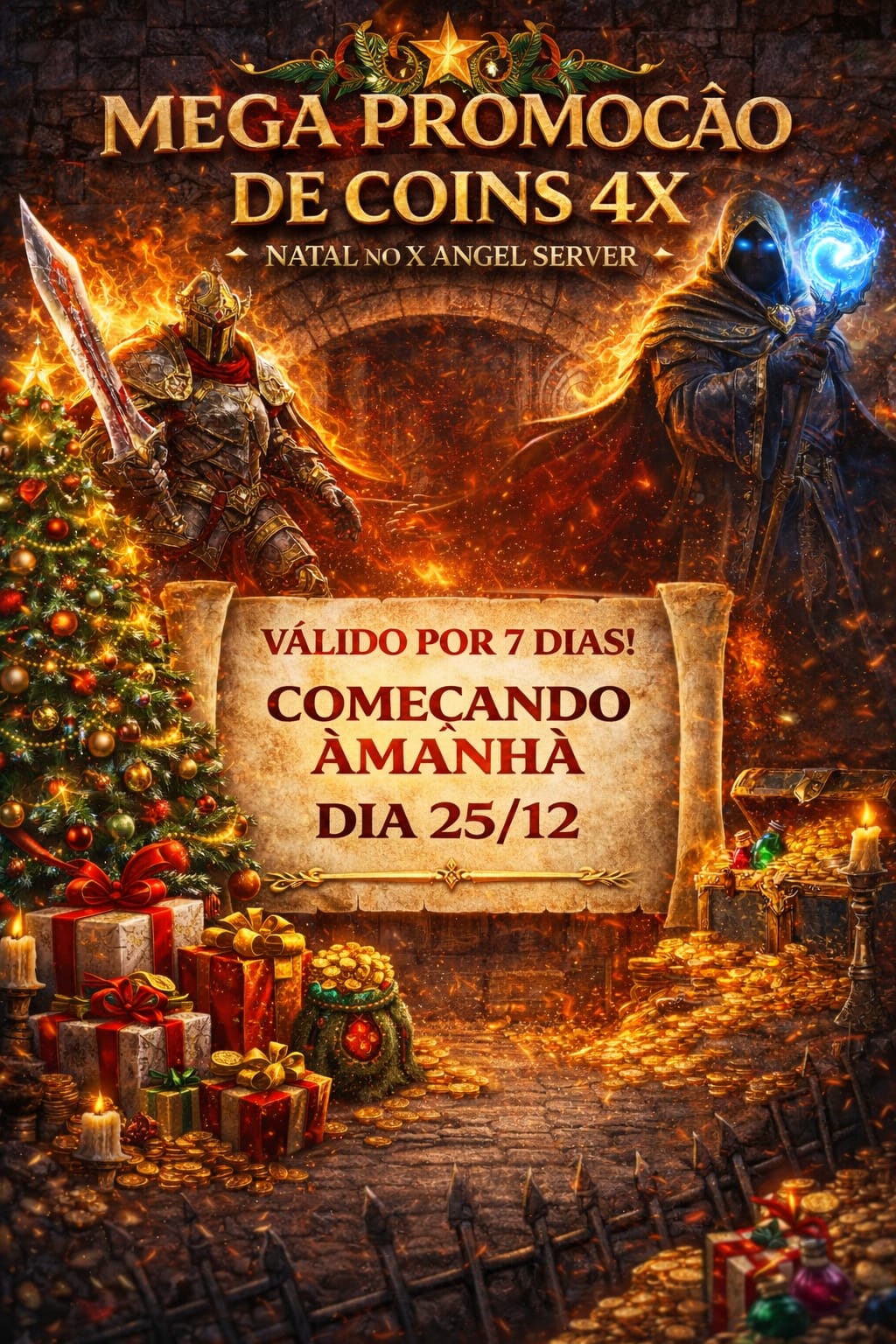 🛡️🔥 O Grande Chamado das Terras de X Angel! 🔥🛡️A partir desta Sexta-feira, 19 de Dezembro, às 19:00h, os céus se abrem e uma poderosa bênção recai sobre todo o continente: Durante este período, heróis e aventureiros sentirão suas habilidades florescerem em ritmo acelerado, enquanto criaturas tombarão deixando riquezas jamais vistas. 📜 Início: Sexta-feira — 19/12/2025 às 19:00h Erga sua espada, prepare suas runas, convoque seus aliados e marche rumo à glória.